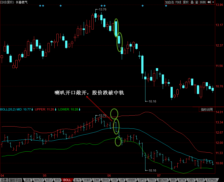 实例:长春燃气股价于2013年6月6日跌破BOLL中轨,同时BOLL指标上轨开始向上、下轨开始向下,形成喇叭开口形态,说明下跌行情带动股价加速波动,股价将加速下跌。